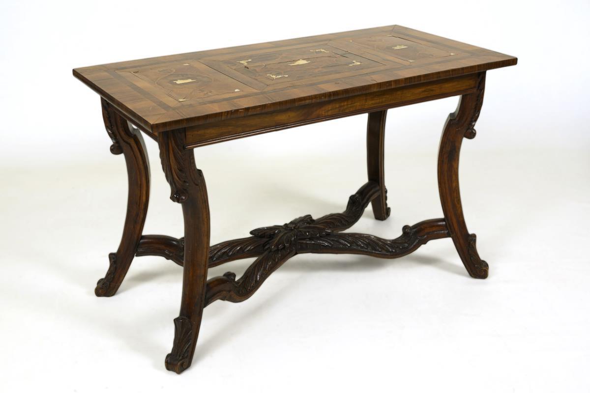 Elegant rectangular salon table on 4 curved legs with cross bracing and acanthus leaf carvings, table top finely decorated with bandelwerk and small leg inlays with figures of Greco-Roman mythology. Signs of age/use, veneer with drying cracks.
