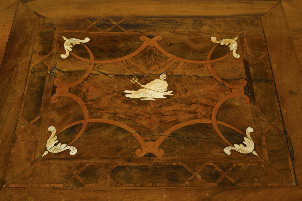 Solid walnut, mahogany or walnut veneered and burl, various woods marquetry, bone. Approx. 77 x 123.5 x 62 cm.
