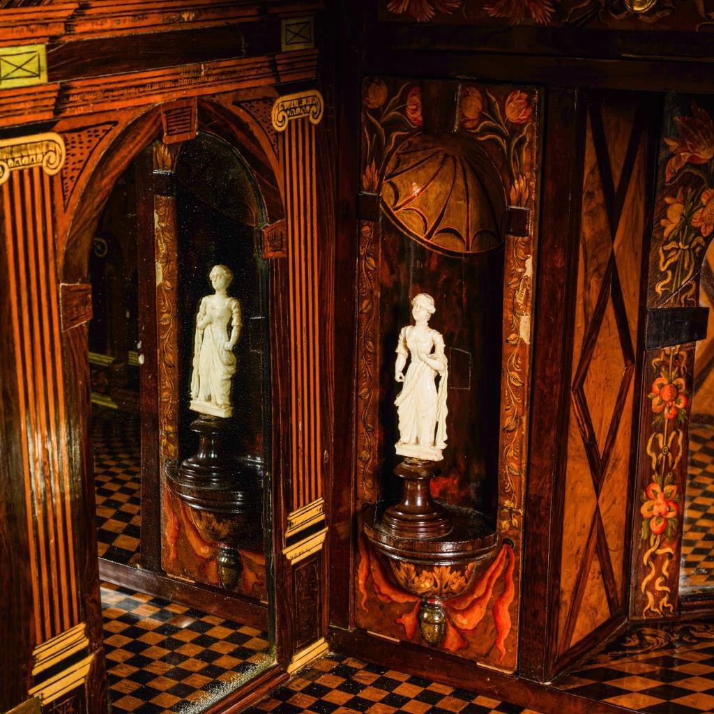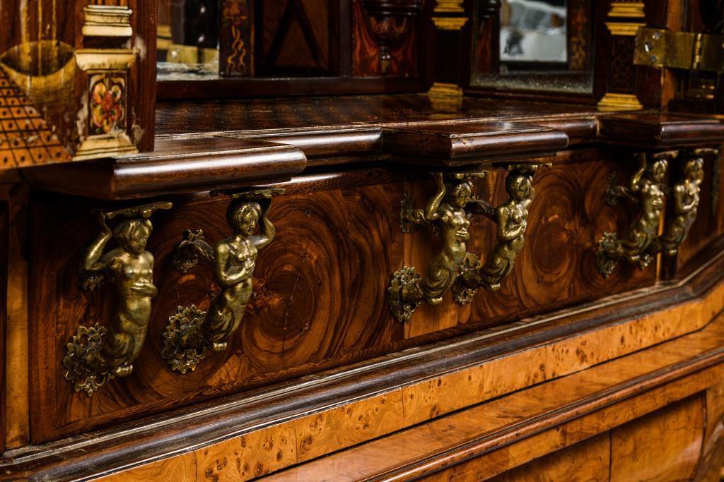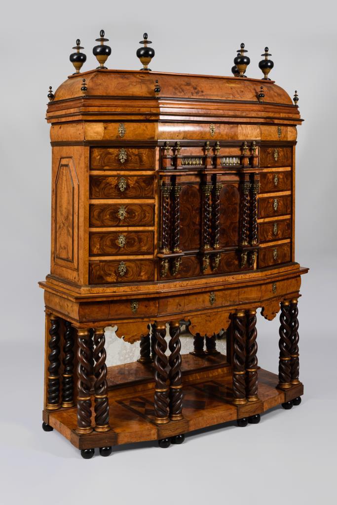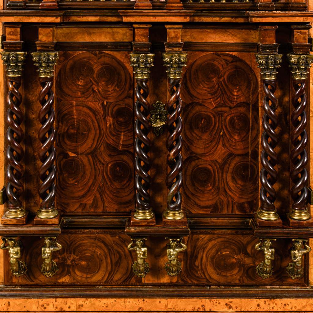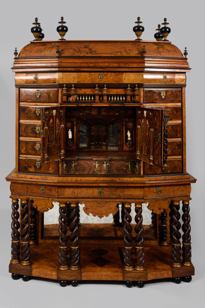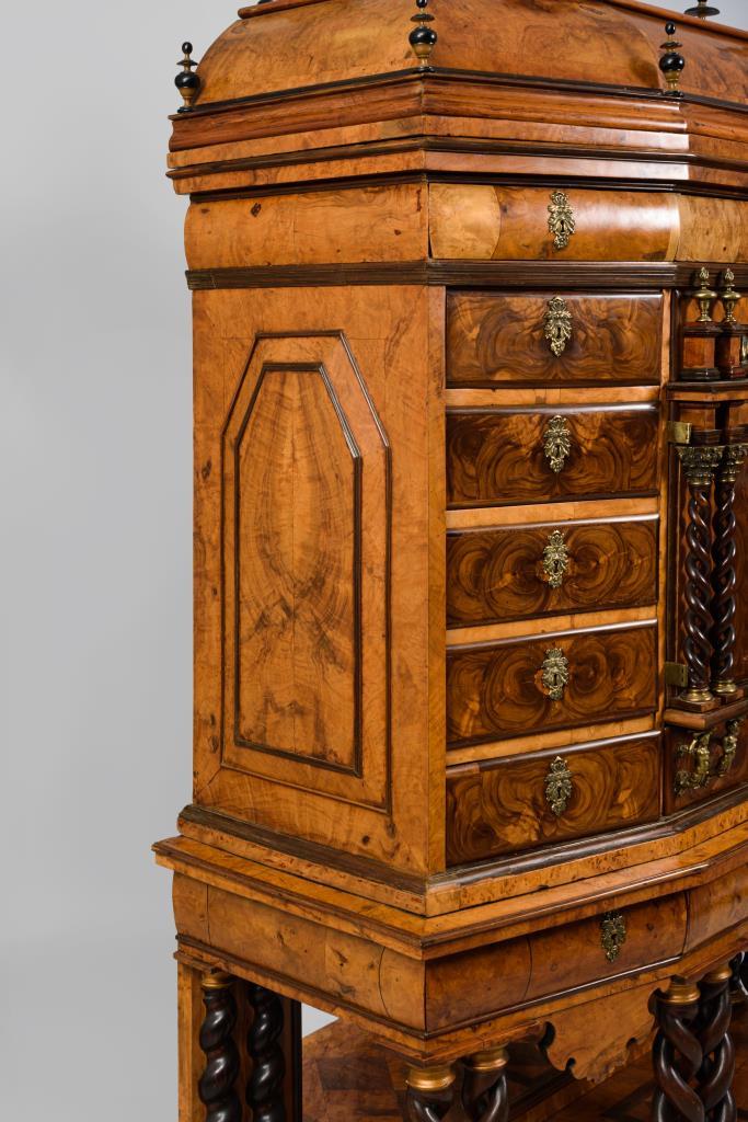 Prunkvoller Kabinettschrank mit kastenförmigem Tabernakelaufsatz auf tischartigem Unterbau. Kabinett mit üppiger, ebonisierter Urnenbekrönung, 3-teiligem Kopfschub und elegant dekorierter Schauseite mit je 5 seitlichen Schüben und architektonisch gegliederter 2-flügeliger Tür mit 6 vorgesetzten Doppelwund-Säulen, goldbronzierten korinthischen Kapitellen, Balustrade und Karyatiden sowie Messingbeschlägen in Groteskenform. Hinter der Balustrade und den Karyatiden befindet sich ein Schub. Schmalseiten mit Kassettenfüllung. Unterteil mit 8 gedrechselten Beinen mit doppeltem Wund und verspiegelter Rückwand mit gedrechselten Halbsäulen sowie 3-teiligem Zargenschub mit geschweifter Zarge. Aufwändig verzierte Kulissengestaltung im Innenteil mit parkettiertem Boden, 2 Ädikulä und Wandspiegeln, fein bemalt mit Architektur, Tulpen und Nelken sowie akzentuierter Elfenbeinmarketerie verziert; herausnehmbare Ädikulä mit vollplastischer männlicher und weiblicher Elfenbeinfigur (dahinter je 3 Geheimfächer). Innenseiten der Türen mit gemaltem Rundbogengang und zarter Tulpenbemalung im Deckenbereich, ebenfalls akzentuiert mit Elfenbeinmarketerie. Unter Verwendung alter Teile wohnfertig restauriert, Trockenrisse, Alters-/Gebrauchsspuren.