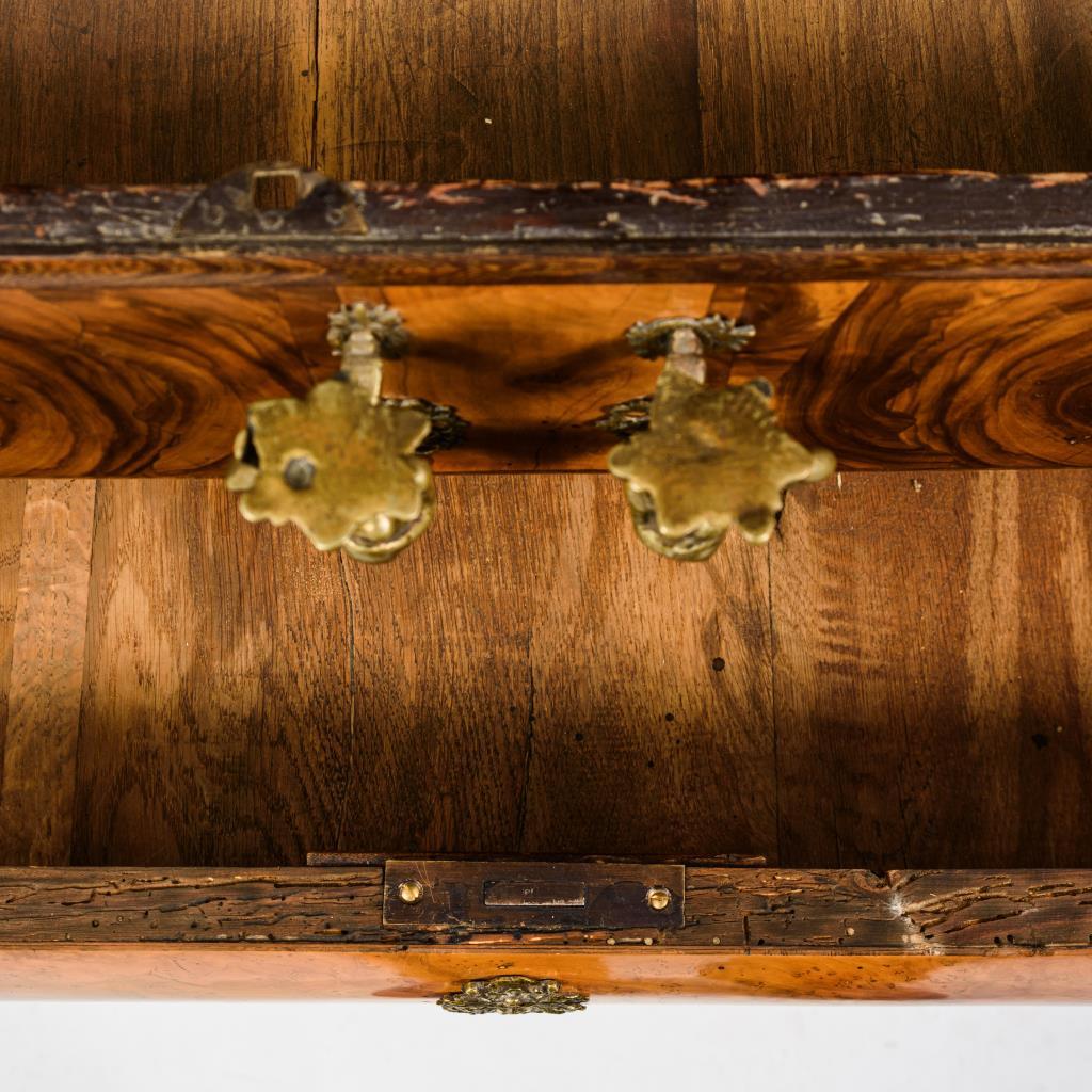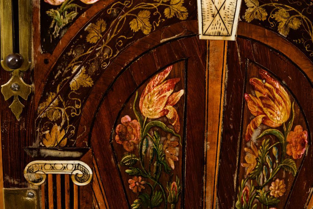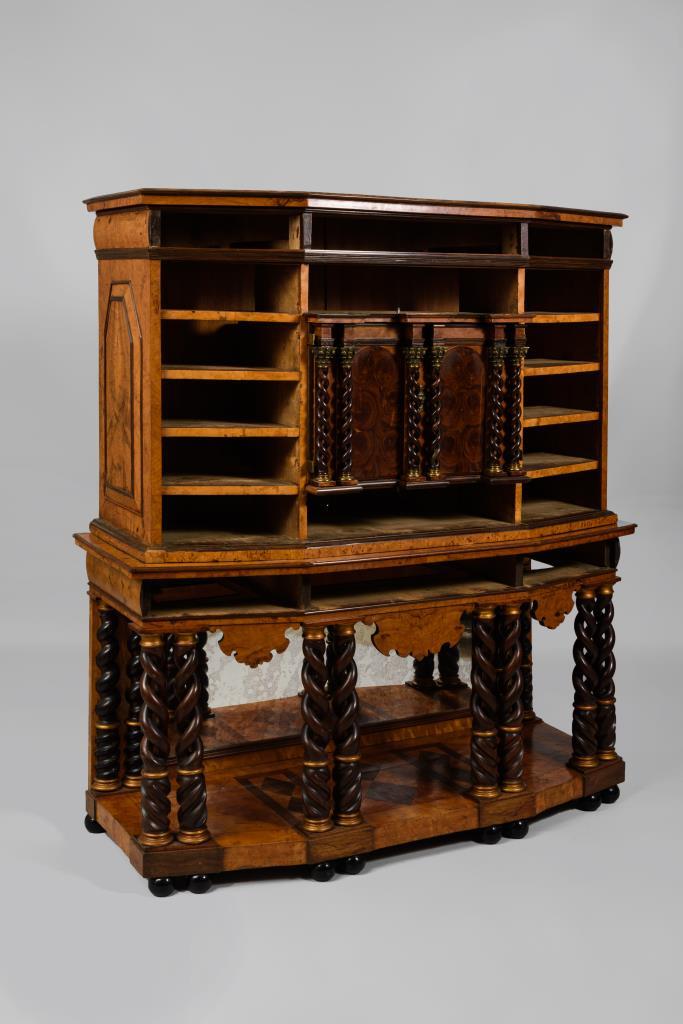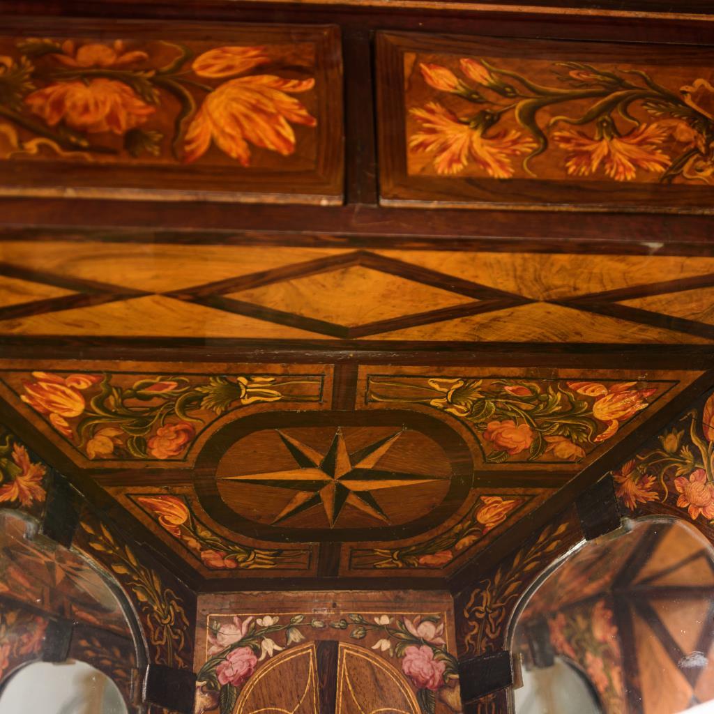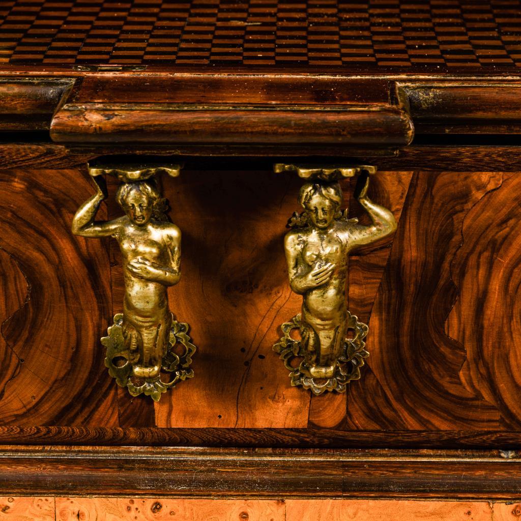 Prunkvoller Kabinettschrank mit kastenförmigem Tabernakelaufsatz auf tischartigem Unterbau. Kabinett mit üppiger, ebonisierter Urnenbekrönung, 3-teiligem Kopfschub und elegant dekorierter Schauseite mit je 5 seitlichen Schüben und architektonisch gegliederter 2-flügeliger Tür mit 6 vorgesetzten Doppelwund-Säulen, goldbronzierten korinthischen Kapitellen, Balustrade und Karyatiden sowie Messingbeschlägen in Groteskenform. Hinter der Balustrade und den Karyatiden befindet sich ein Schub. Schmalseiten mit Kassettenfüllung. Unterteil mit 8 gedrechselten Beinen mit doppeltem Wund und verspiegelter Rückwand mit gedrechselten Halbsäulen sowie 3-teiligem Zargenschub mit geschweifter Zarge. Aufwändig verzierte Kulissengestaltung im Innenteil mit parkettiertem Boden, 2 Ädikulä und Wandspiegeln, fein bemalt mit Architektur, Tulpen und Nelken sowie akzentuierter Elfenbeinmarketerie verziert; herausnehmbare Ädikulä mit vollplastischer männlicher und weiblicher Elfenbeinfigur (dahinter je 3 Geheimfächer). Innenseiten der Türen mit gemaltem Rundbogengang und zarter Tulpenbemalung im Deckenbereich, ebenfalls akzentuiert mit Elfenbeinmarketerie. Unter Verwendung alter Teile wohnfertig restauriert, Trockenrisse, Alters-/Gebrauchsspuren.
