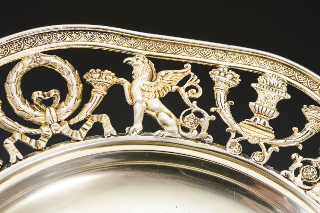 Schale mit durchbrochenem Rand. Verziert mit Greifen-, Kranz- und Füllhorn-Motiven. Auf 4 Tatzenfüßen. Etwas gedellt, unterseitig Lötspuren.