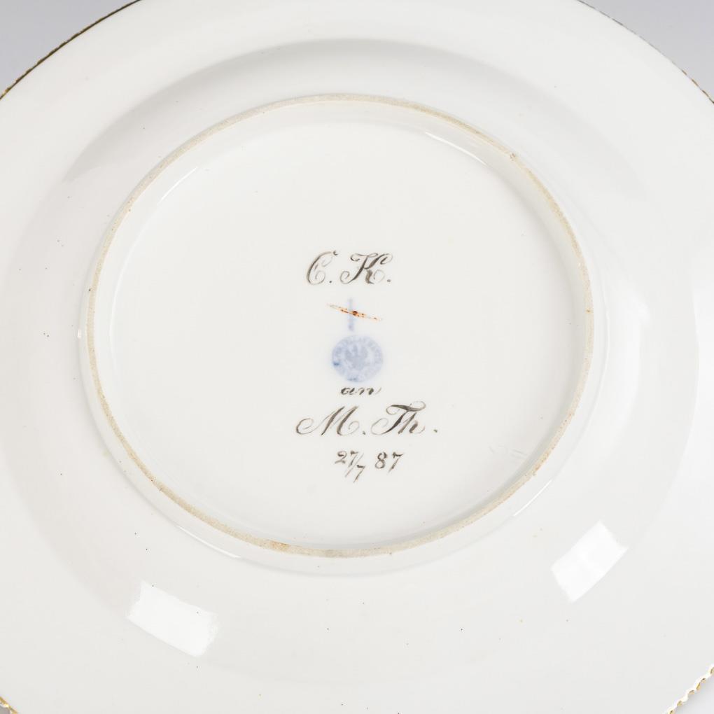 Plate with vegetal bisque relief bands, pearl bands and rose painting in purple and gray tones, inscribed on the bottom "C.K. an M.Th. 27/ 7 87". Gold rubbed.