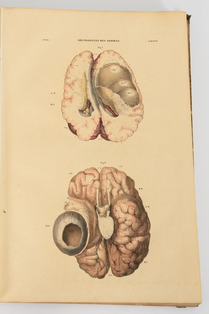 Insgesamt 147 teils farbige Lithographietafeln zum Thema "I. Abtheilung: Krankheiten des Gehirns, des Schädels, des Rückenmarks und der Wirbelsäule; II. Abtheilung: Krankheiten des Halses (Speiseröhre) sowie Krankheiten des Herzens, der Lunge, Brustdrüsen und Bronchien. Tafeln teils unsortiert geheftet, nicht immer nach der Reihenfolge. Eventuell fehlen einige Tafeln. Blätter auf unterschiedlichen Papieren, teils stockfleckig oder braunrandig. Rücken lose. Halbleineneinband mit stärkeren Nutzungsspuren.