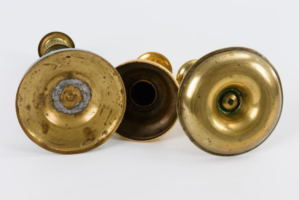 Je Rundfuß mit Säulenschaft, 1x mit Vasentülle, 1x als Schiebeleuchter. Größter Leuchter mit Lötreparatur am Fuß und Haarriss an der Tülle, Schiebeleuchter mit wenigen Alters-/Gebrauchsspuren.