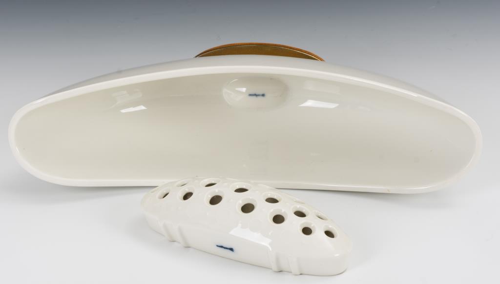 Weiß mit Goldstaffage, Messing, Holz.L 33,5 cm, H 15 cm.