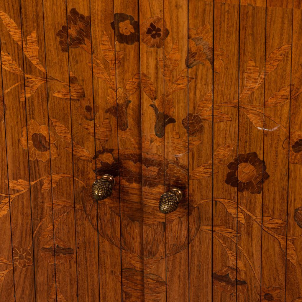 Leicht bauchiger Salonschrank im Stil des französischen Rokoko mit Rolltüren, Schub, ausziehbarer Schreibplatte und roter Marmorplatte, dekoriert mit üppiger Blumenmarketerie und Bronze-Applikationen. Restaurierungsbedürftig.