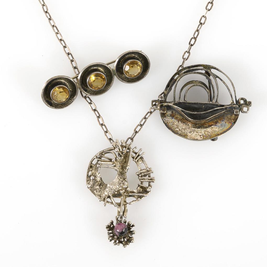 Silver 925 stamped, tested. Pendant 4.5 x 2.7 cm. Chain L 54 cm. Brooches Ø 4.0/4.8 x 1.5 cm. 11,9/8,7/8,0 g.