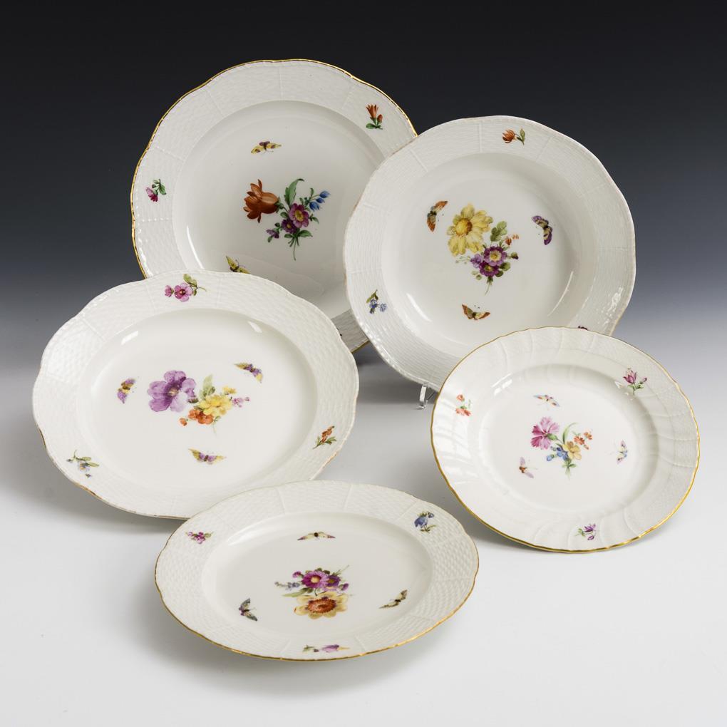 4x model "Altozier": soup plate, dinner plate, appetizer plate and breakfast plate (Ø 21-26 cm). / 1x Model "Neuozier": breakfast plate (Ø 19.5 cm). 1x Goldran rubbed, partly with traces of use in the mirror.