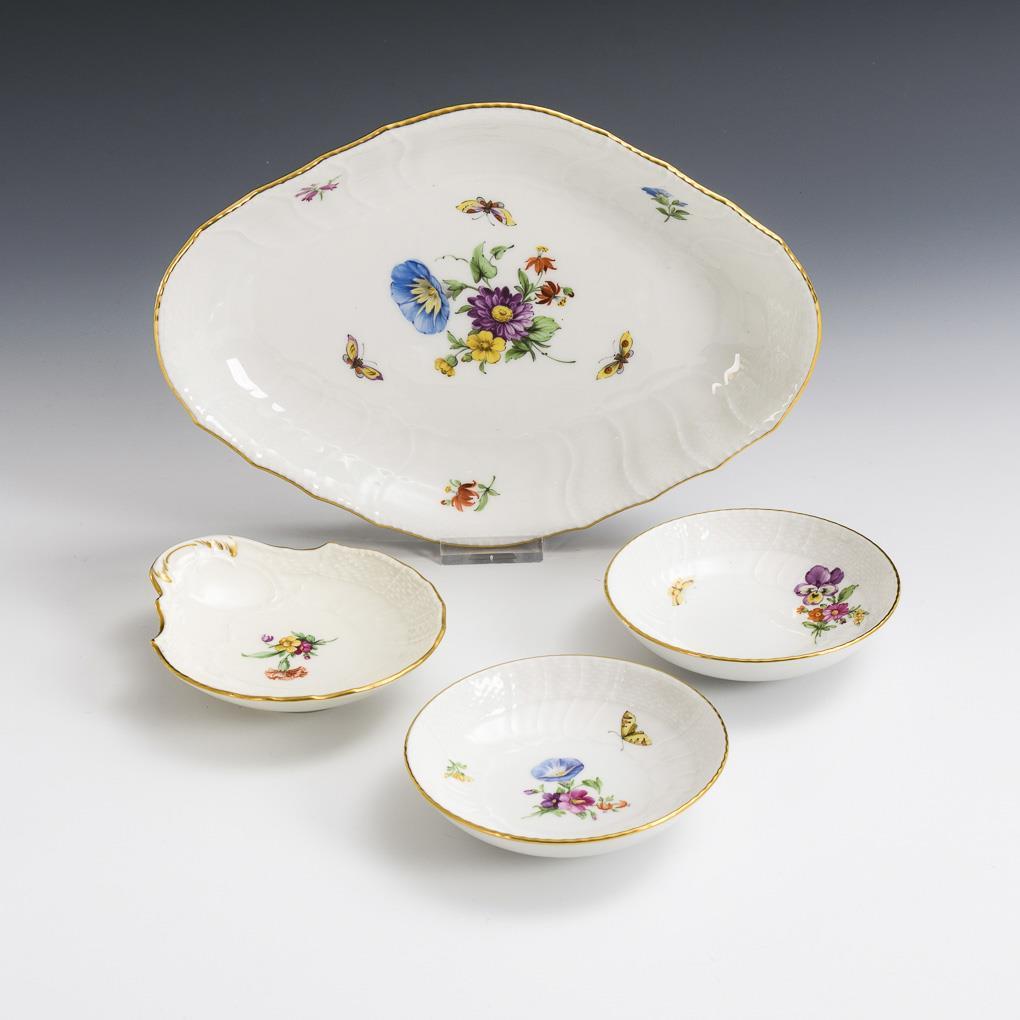 Model "Neuozier". Predominantly painted with flowers and insects. Oval bowl (L 26 cm), 2 small bowls (Ø 11 cm) and shell bowl (Ø 12.5 cm).