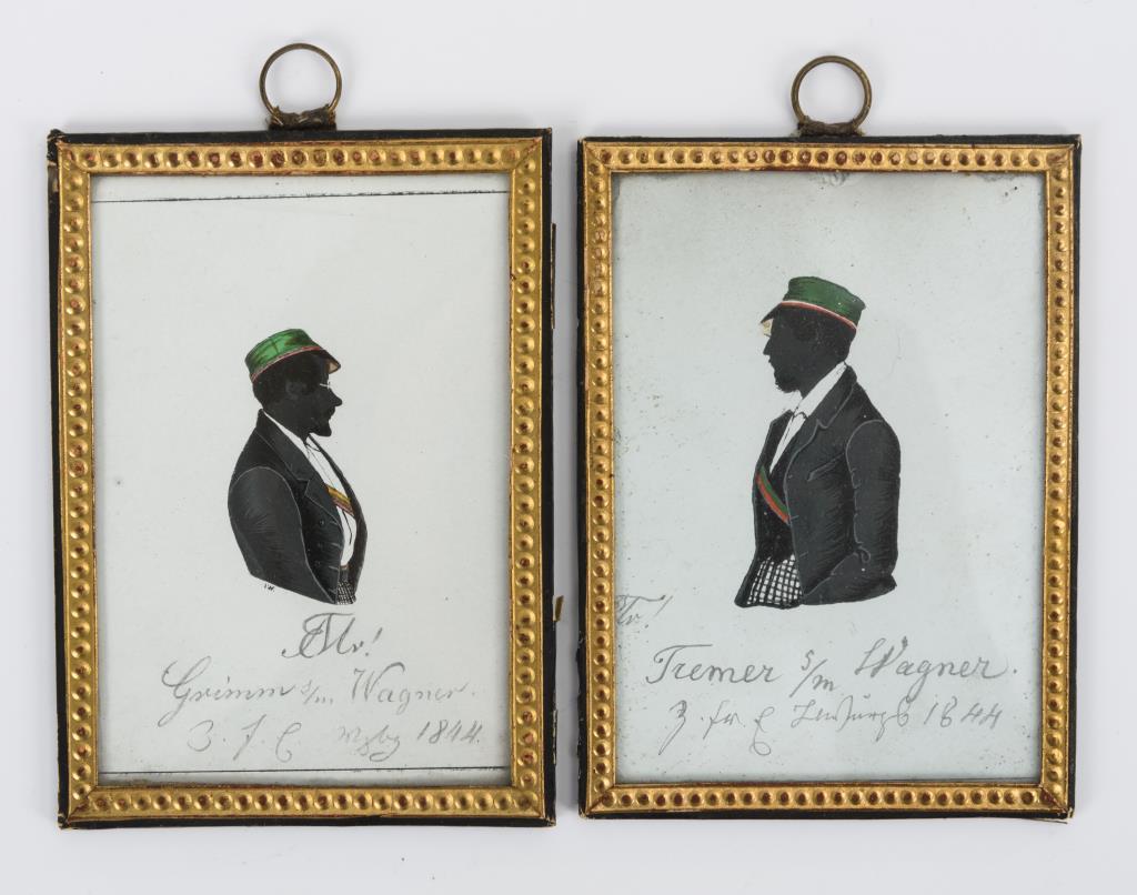 Profil-Hüftbildnisse der Studenten unter Glas, mit Papierrahmung. Kaum Alters-/Gebrauchsspuren.