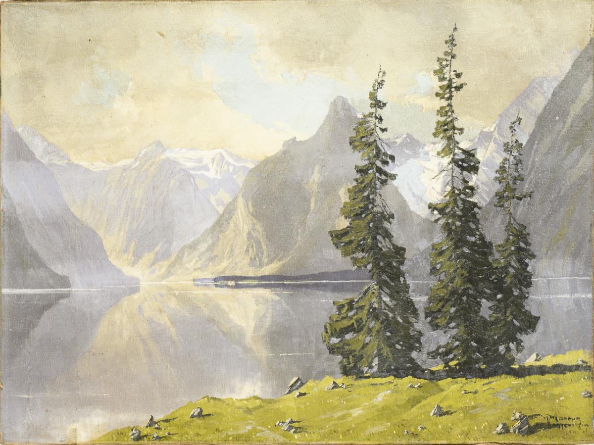 View from the elevated meadow over the reflecting lake in front of the mountains. A defect.