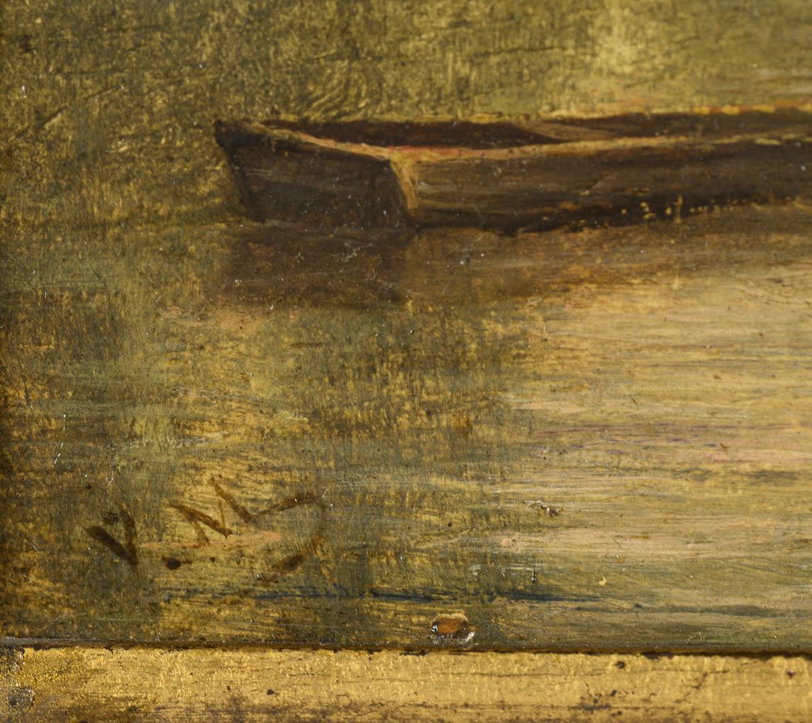 Boatman on calm water in atmospheric evening light. Minimal signs of age.