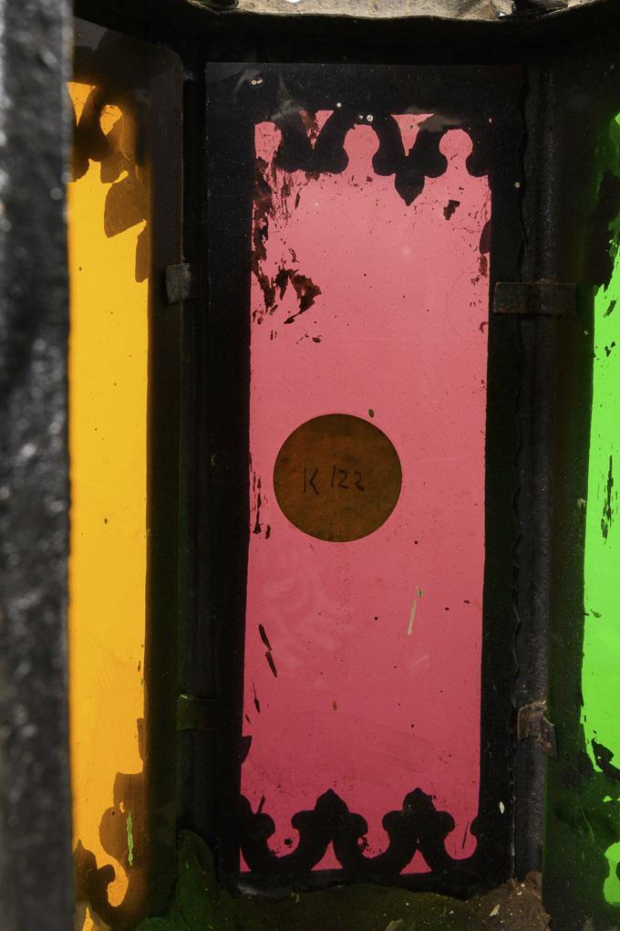 1-flame hall lamp with 6-sided glazed body on central strut, lushly decorated with acanthus leaf crown and drop-shaped acanthus leaf suspension with original candle spout; special light give the different colored glass inserts in red, green, purple and orange; on 1 side hinged acanthus leaf to replace the candle as well as body part of the red glass plate designed as a door to extinguish the candle. Traces of age / use.