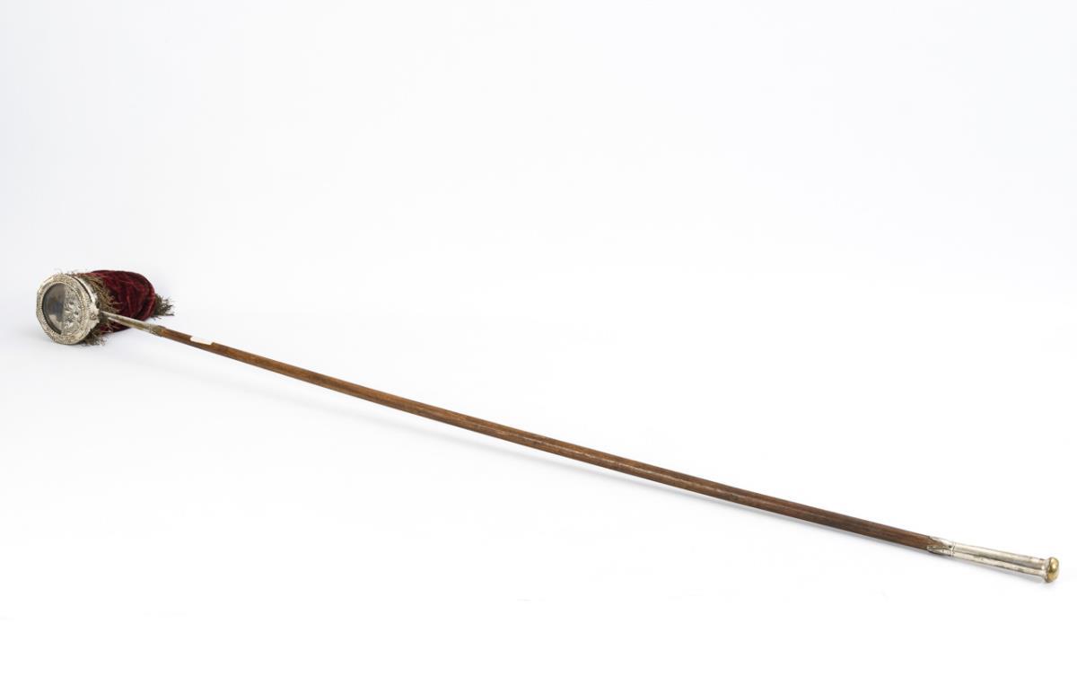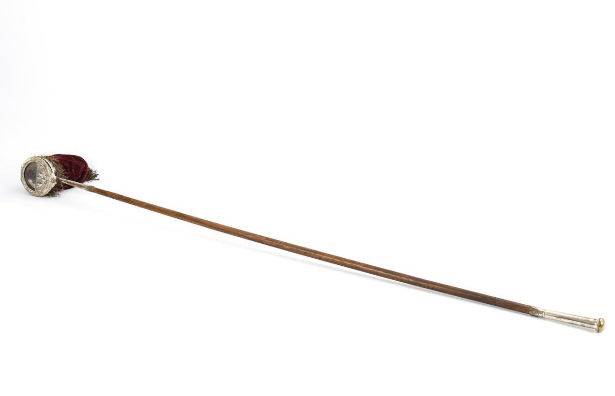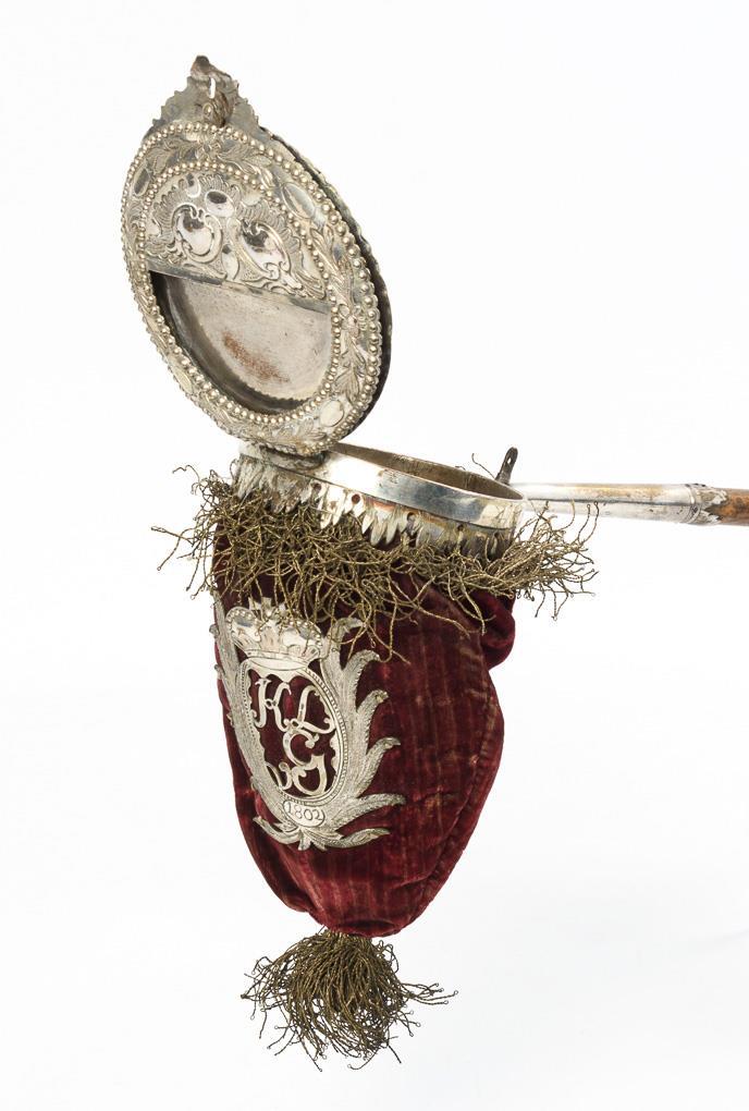 On the long stick with end knob mounted bell pouch with decorated hinged lid as well as applied monogram "KLvdG" with date "1802" in wreath with princely crown. Signs of age/use.