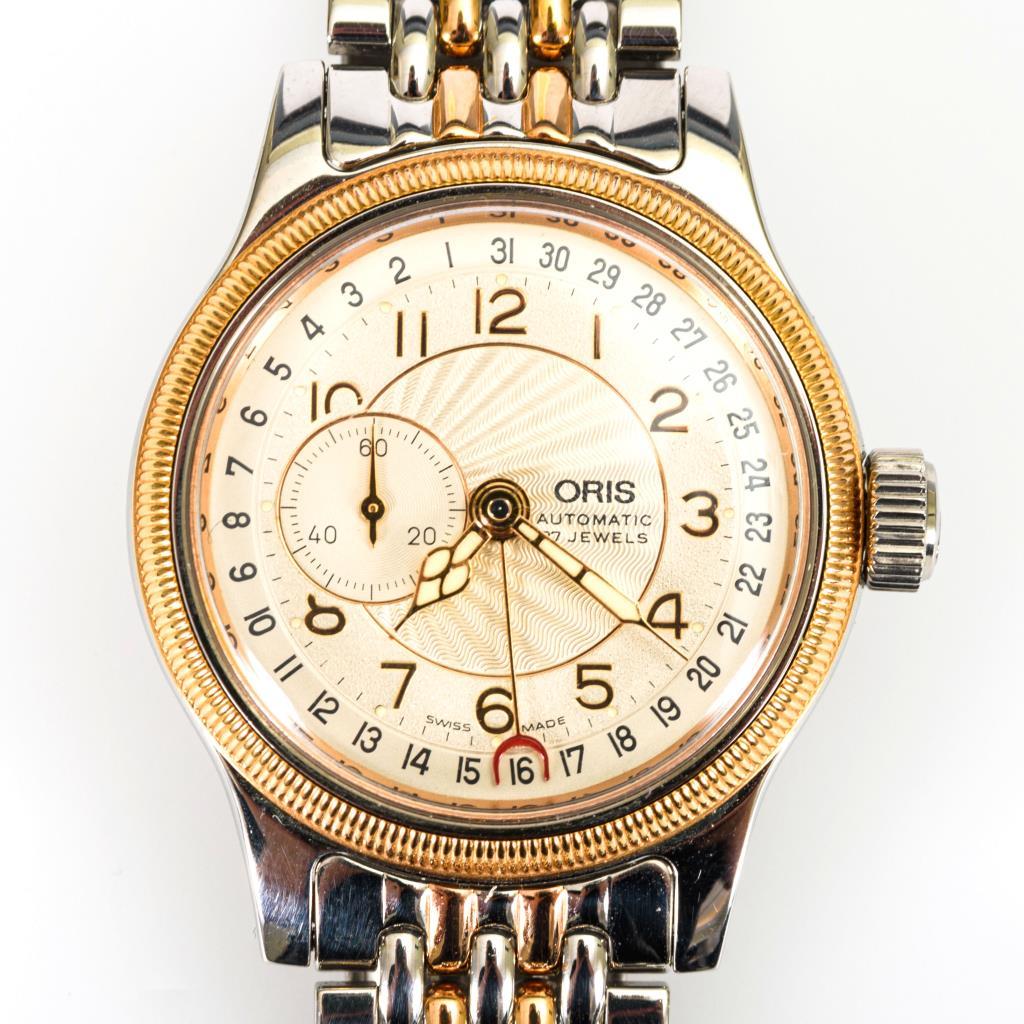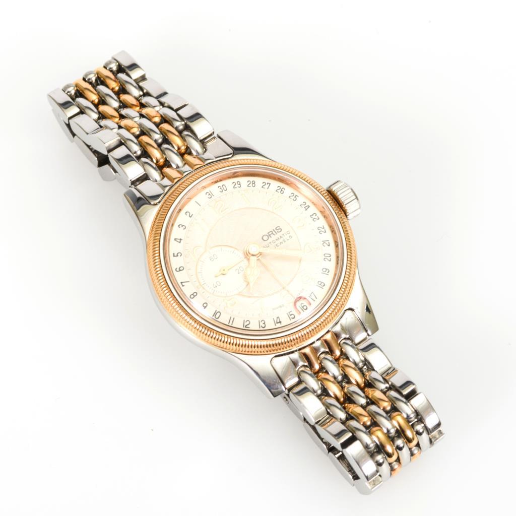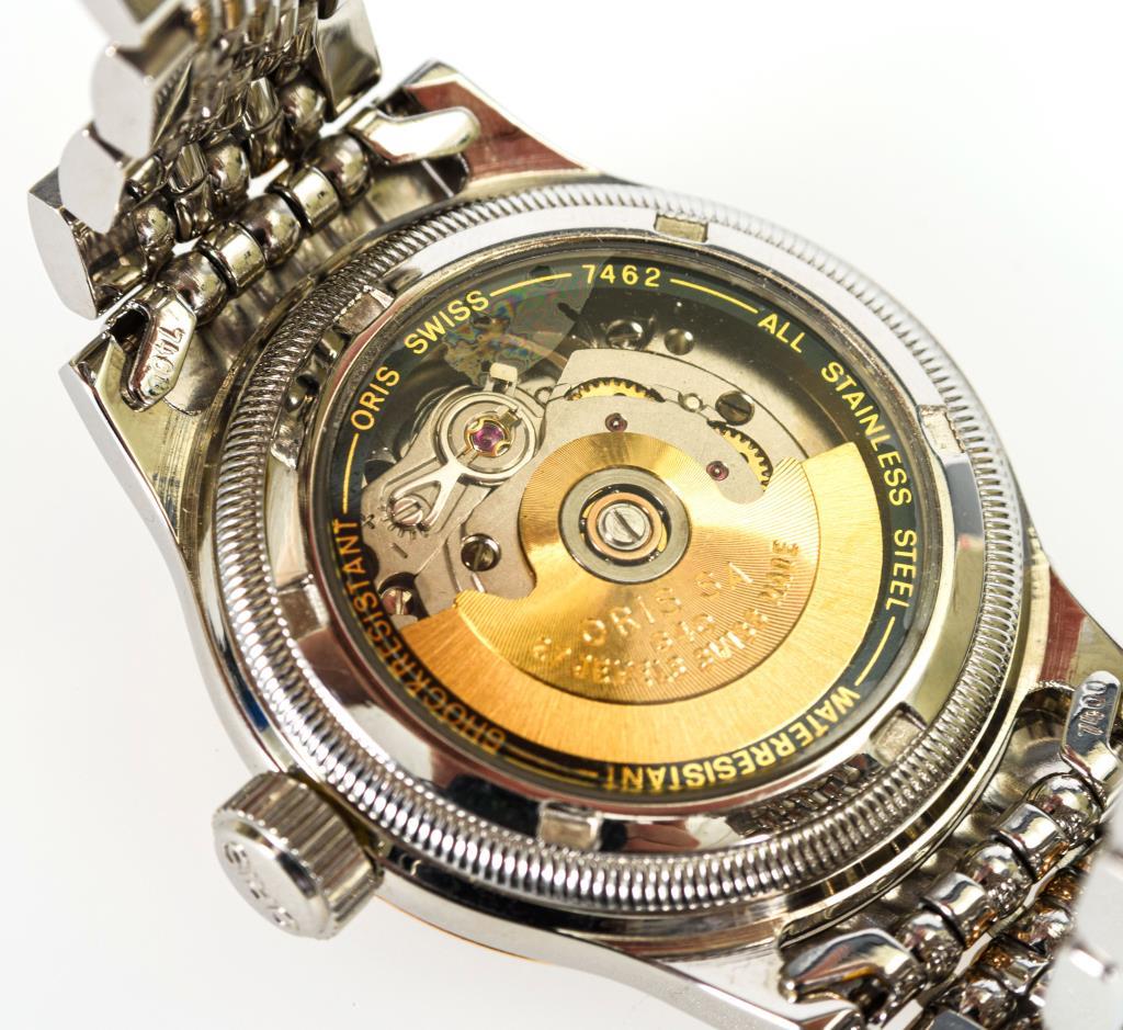 Gehäusenummer: 7462.Automatikwerk, Oris-Kaliber 640.Silbernes, teils guillochiertes Zifferblatt mit arabischen Zahlen, Leuchtpunkten, Leuchtzeigern, kleiner Sekunde, Datumsanzeige.Herstellerprägung Anzeige: "Oris Automatic".