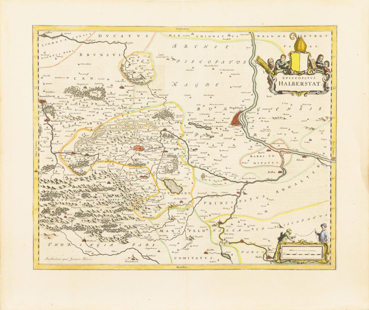 Detailed historical map of the High Chapter of Halberstadt, with figural title cartouche "Episcopatus Halberstadt" and cartouche with scale; verso accompanying text in Dutch. Backglued centerfold, sheet margin slightly browned.