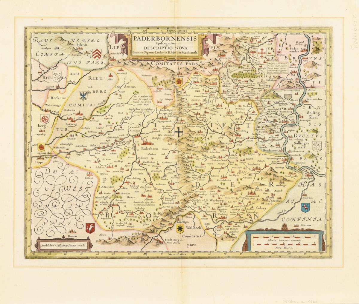 Fine colored historical map of the High Diocese of Paderborn, with scrollwork title cartouche "Paderbornensis Episcopatius Descriptio Nova [...]" and cartouche with scale, verso with accompanying text in Spanish; published by Guiljelmus Blaeuw (=Willem Janszoon Blaeu) in Amsterdam. Buck crease, illustration light browned, traces of handling, upper right backstamp.
