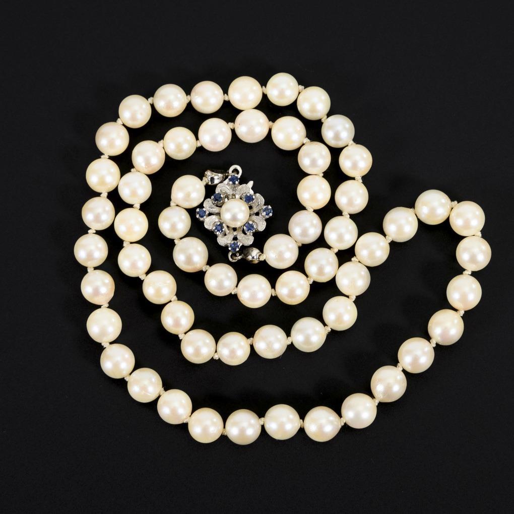 Lacing necklace with cultured pearls in single knot, on decorative clasp with 8 small sapphires and cultured pearl.
