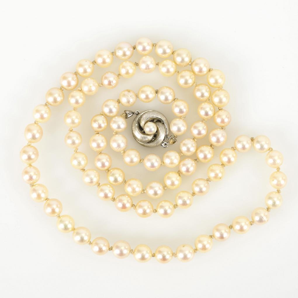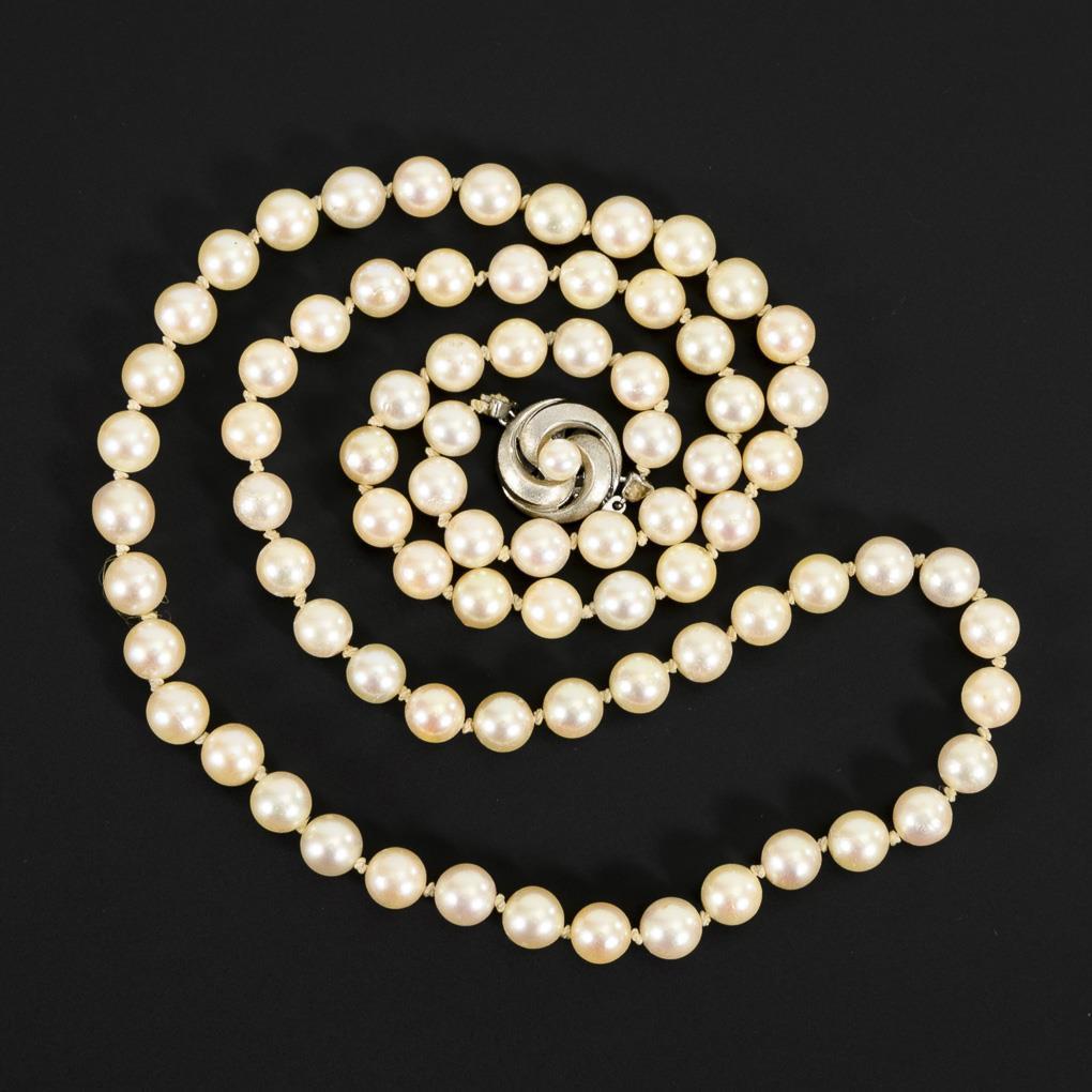 White gold clasp 585 stamped. L 72.5 cm. Beads Ø 7 mm. 52,3 g.