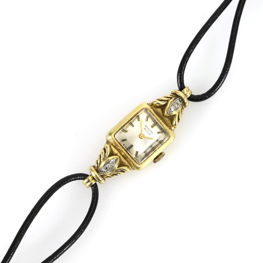 Rectangular case with 6 small diamonds set in relief, line indices and feather crown on black band with metal clip closure. Movement runs.
