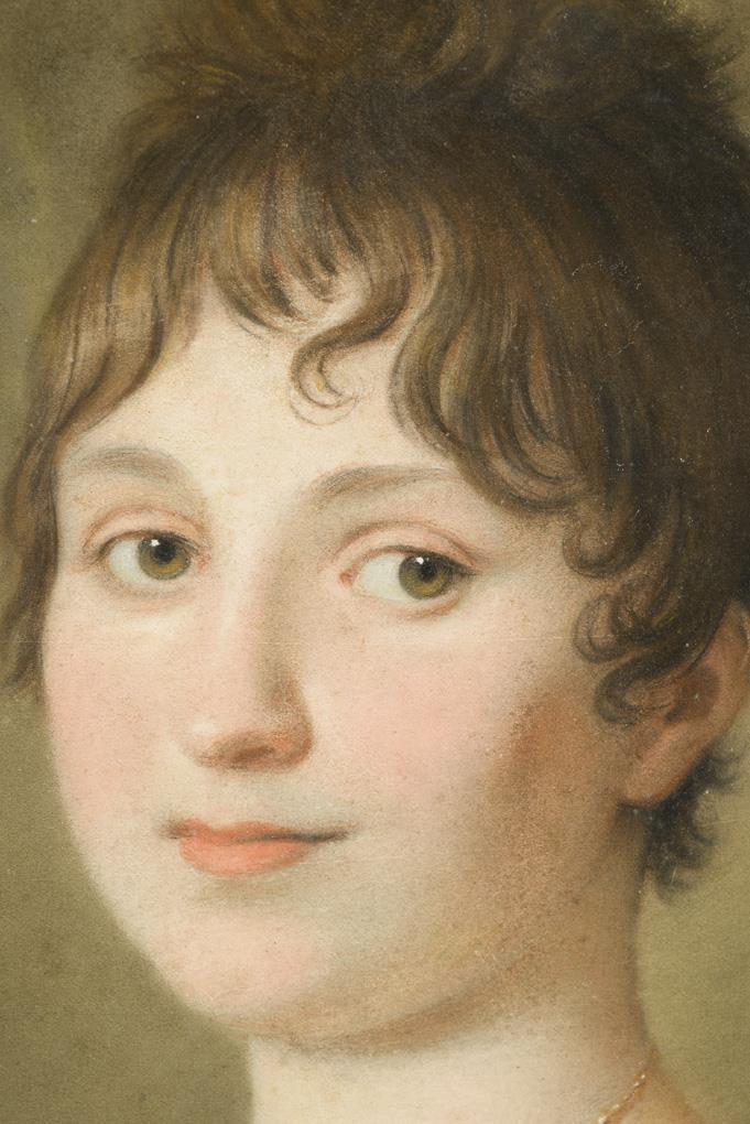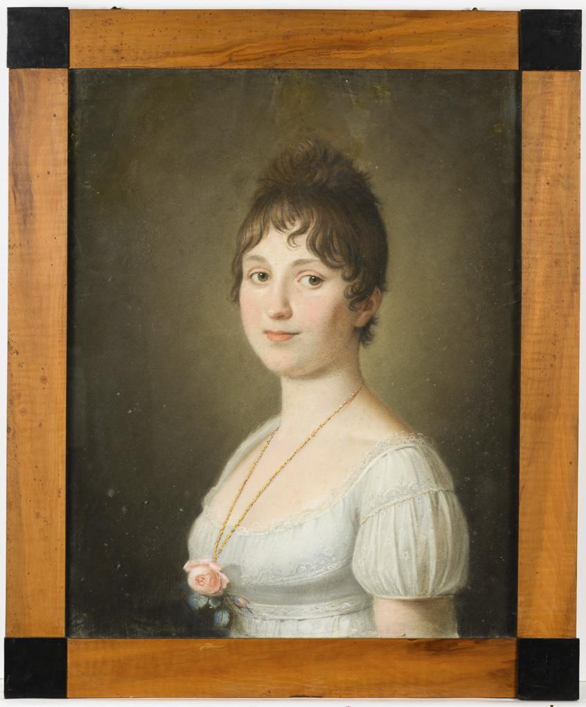 Portrait of a young woman in white dress with fashionable short hairstyle, gold chain and small rose flower. Some signs of age.