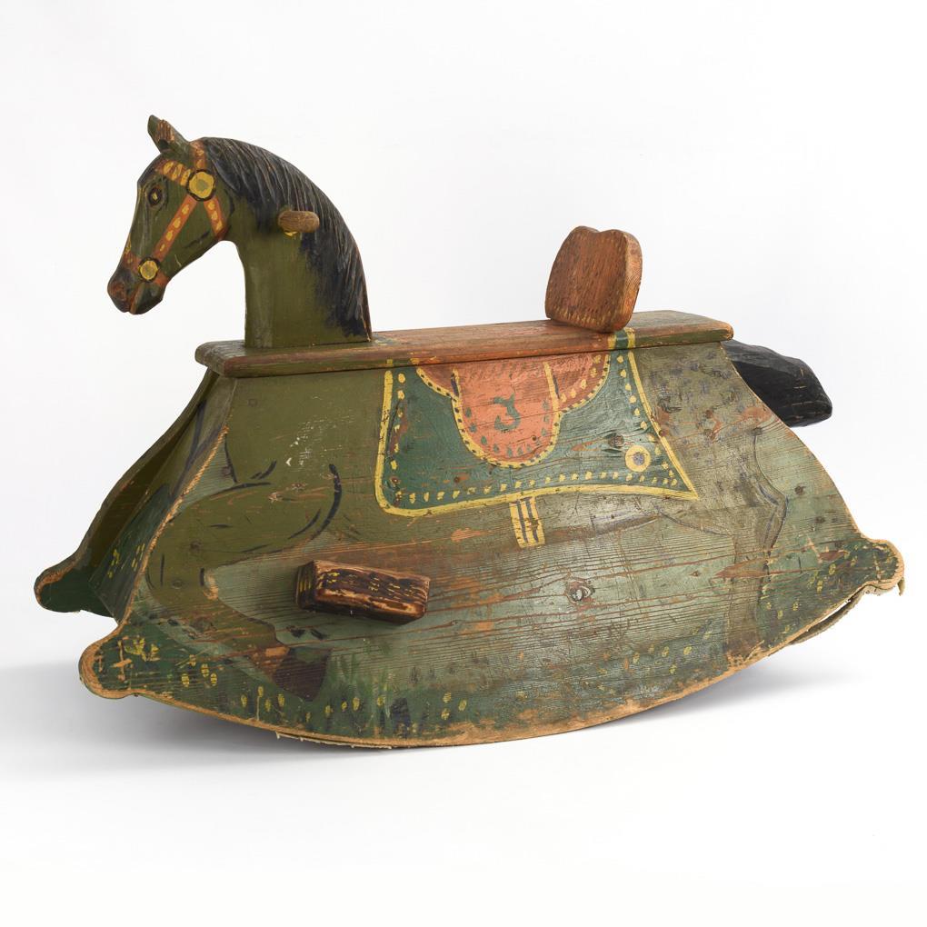 Predominantly green and red designed rocking horse. Traces of age, paint partially rubbed.