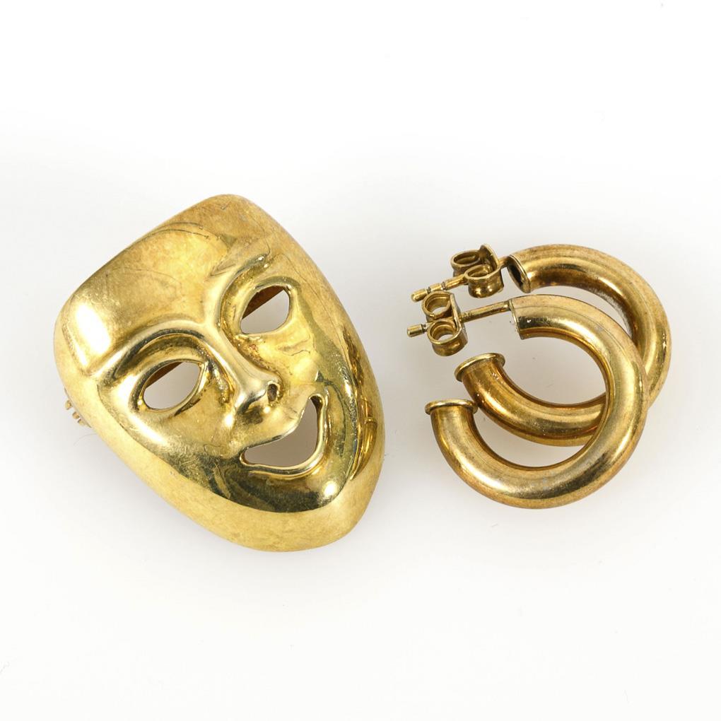 Laughing mask brooch and pair of creoles. Ball hook, plug-in mechanism.