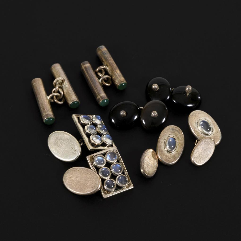 Miscellaneous cufflinks, including moonstone cabochons, green agates and onyxes?, on connecting chains.