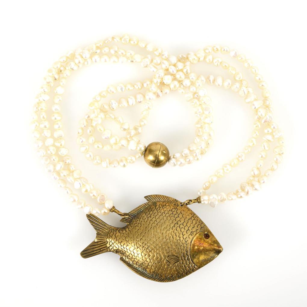 Laced necklaces with small baroque pearls and large sculpted fish pendant. Patent magnetic ball clasp.