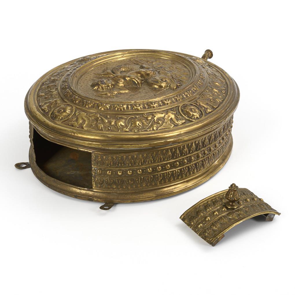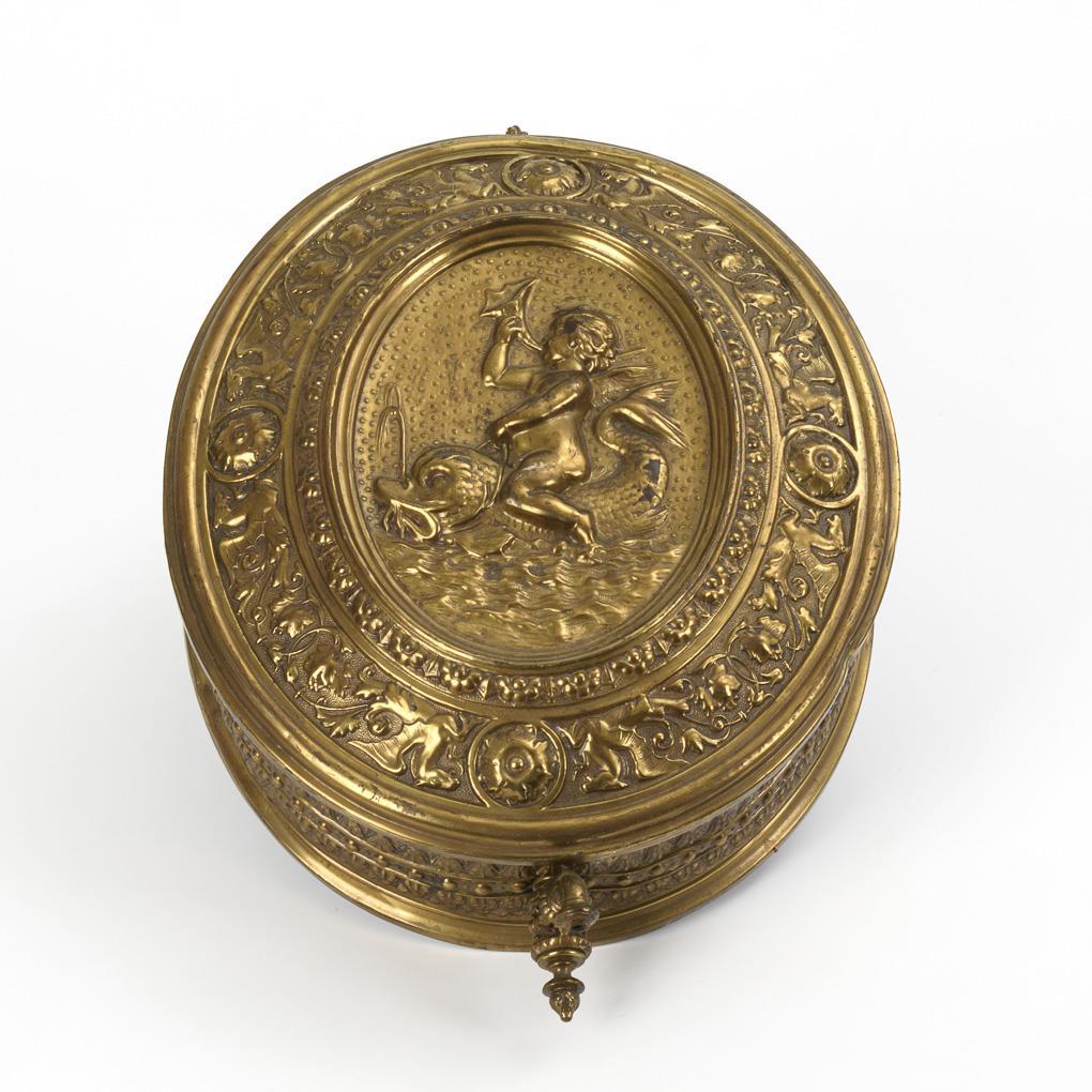 Oval container of a lavabo set with rich relief decoration in the Renaissance style: childlike Triton on a dolphin surrounded by hippocamps with vines and rosettes. Outlet tap with twist lock, top fitting lid with knob. A few signs of age/use.