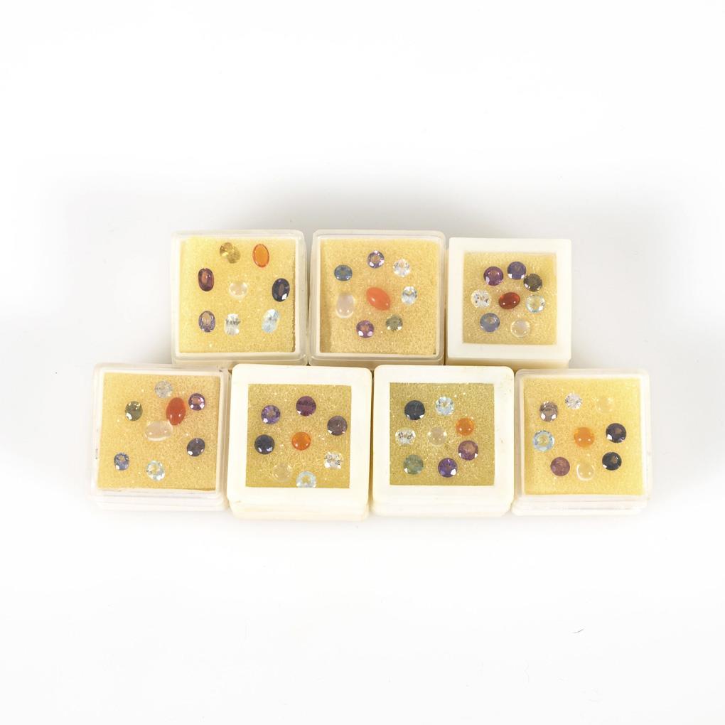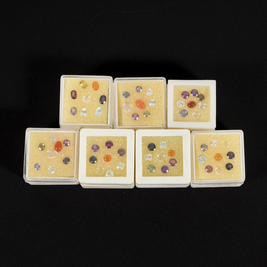 42 faceted color stones (including amethyst, rock crystal, smoky quartz) and 15 cabochons (moonstone, fire opal), in small plastic boxes.