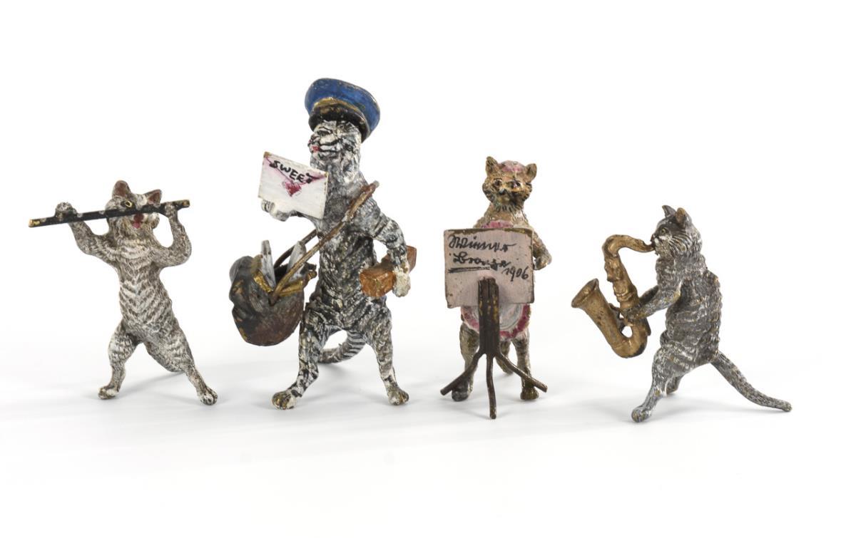 Postman with letter ("sweet"), serving woman with the "menu" "Viennese sherbet 1906", 2 musicians with flute and saxophone. Few color chips.