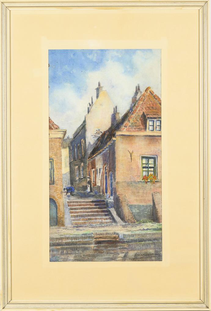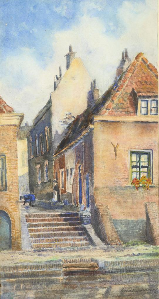 Staffage figures in the sunshine in the narrow alley between the houses by the stairs to the canal. Minimal signs of age.