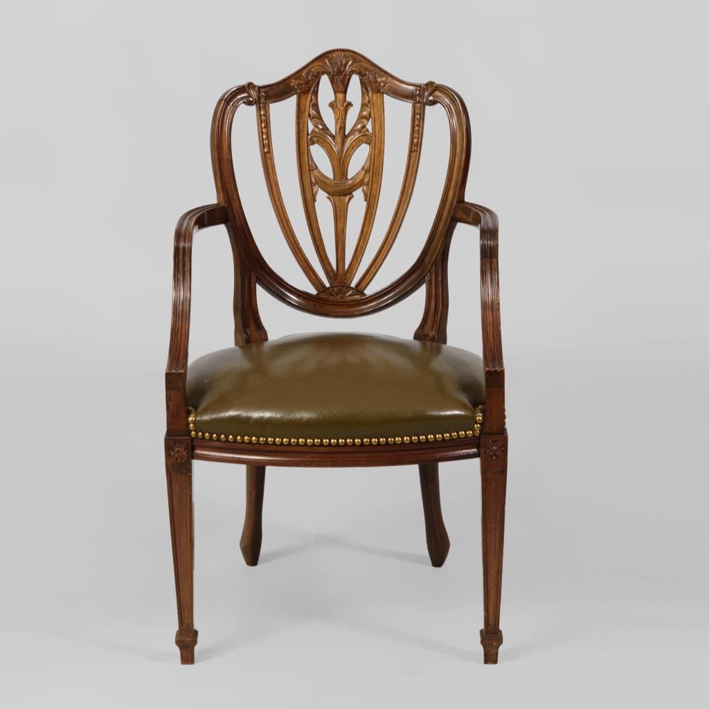 Englischer Armlehnstuhl mit schildartiger Rückenlehne mit durchbrochener, heraldischer Zier, konkav geformten Armlehnen und geraden Beinen; Polster mit khakifarbenem Lederbezug und Ziernägeln. Alters-/Gebrauchsspuren.