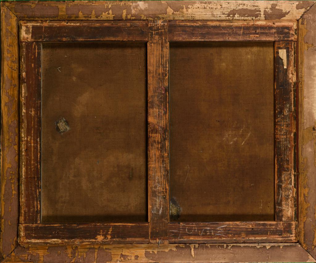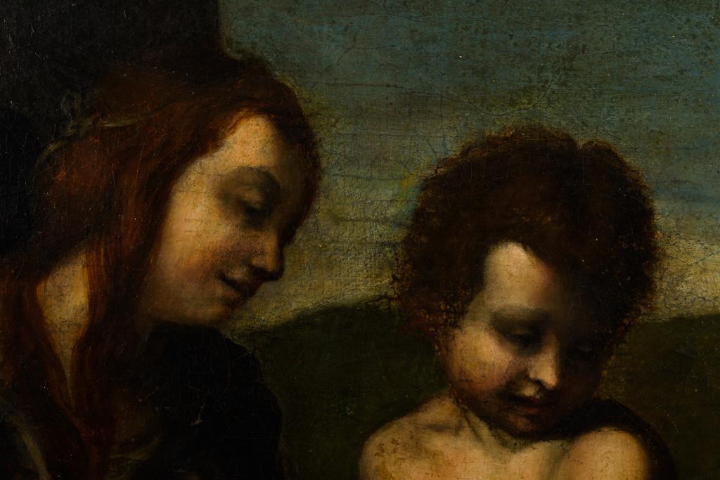 Nach dem Vorbild Leonardos gemalte Familienszene mit Maria, Joseph, dem Jesuskind und dem Johannesknaben an einem Gewässer in bergiger Landschaft. Zwei restaurierte Stellen mit Hinterklebungen.