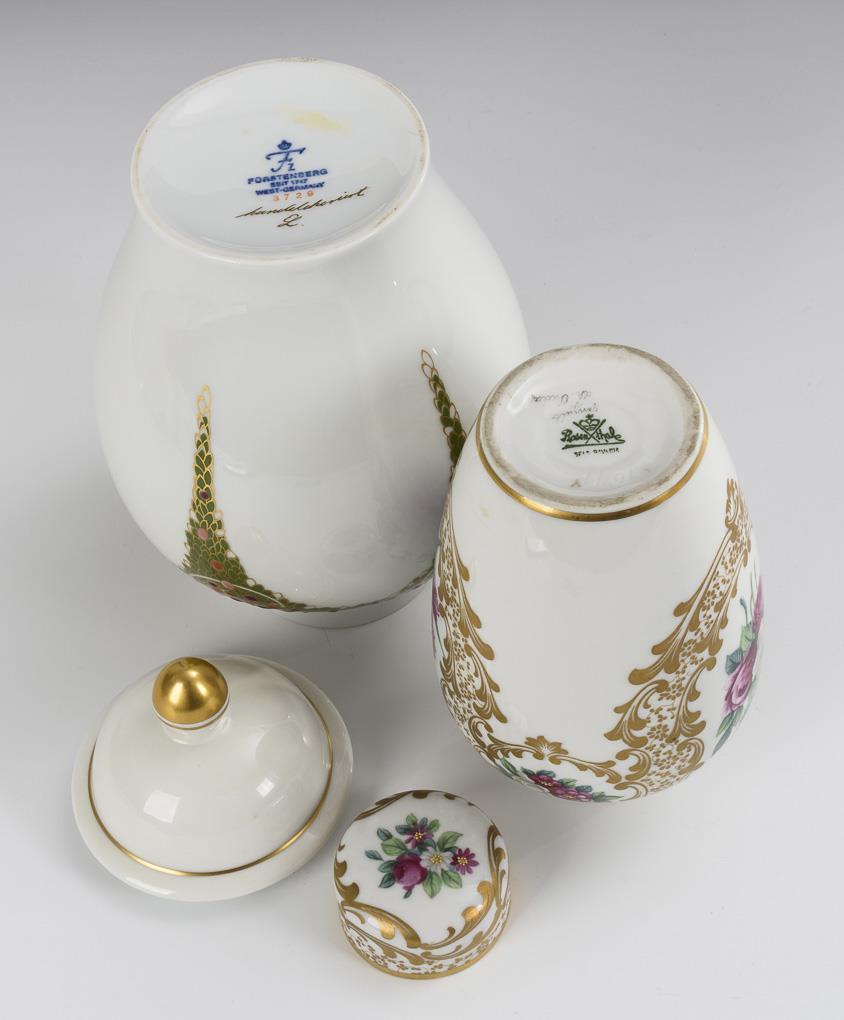 1x Rosenthal, c. 1920: baluster vase with gold decoration and floral painting. / 1x Fürstenberg, 1977: baluster vase designed in the style of Art Nouveau, on the wall a green-gold leaf pattern with colored enamel dots.