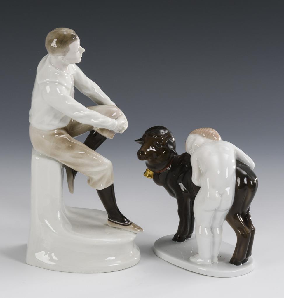 1x marked Rosenthal, circa 1920, designed in 1914 by Albert Caasmann (1886-1968), inscribed: Child with lamb. / 1x marked Schierholz, c. 1910, design by Anton Büschelberger, monogrammed: young man sitting on a pedestal.