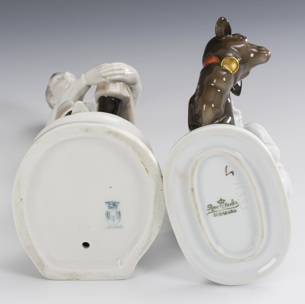 1x marked Rosenthal, circa 1920, designed in 1914 by Albert Caasmann (1886-1968), inscribed: Child with lamb. / 1x marked Schierholz, c. 1910, design by Anton Büschelberger, monogrammed: young man sitting on a pedestal.