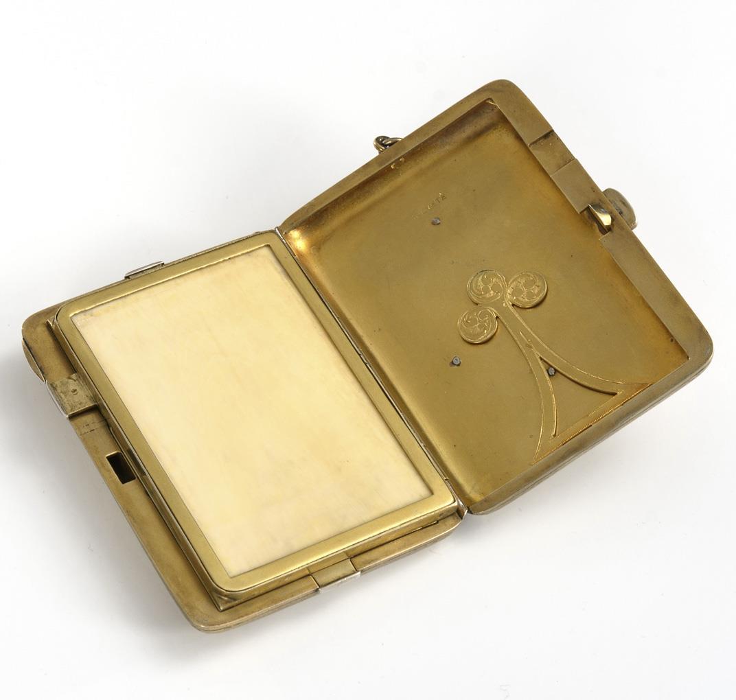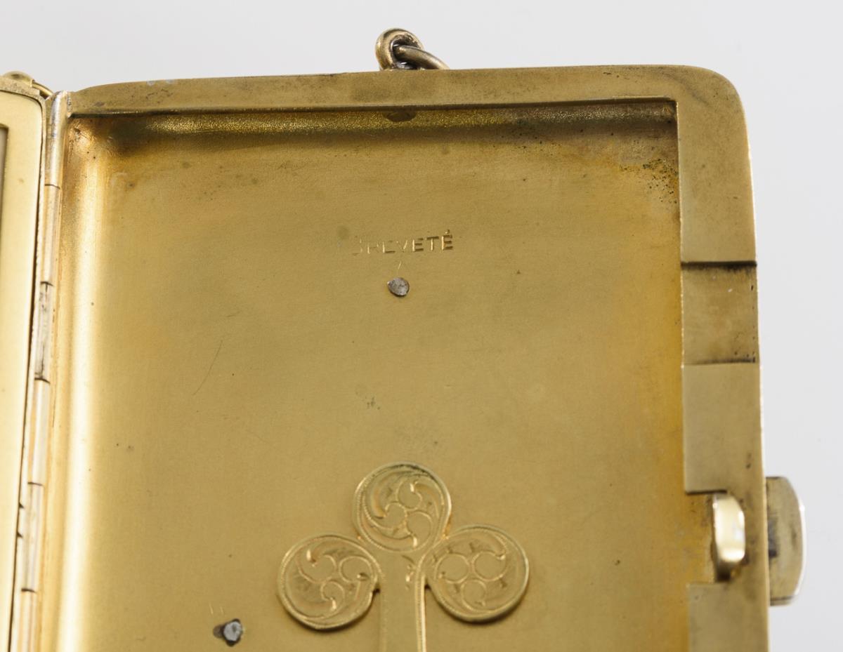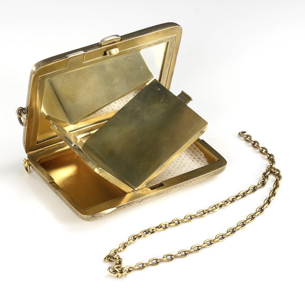 Heavy box with martellation and applied silver monogram "BR" and eyelets for the enclosed carrying chain. Inside mirror and 3 compartments, one with note clip. Chain torn out.
