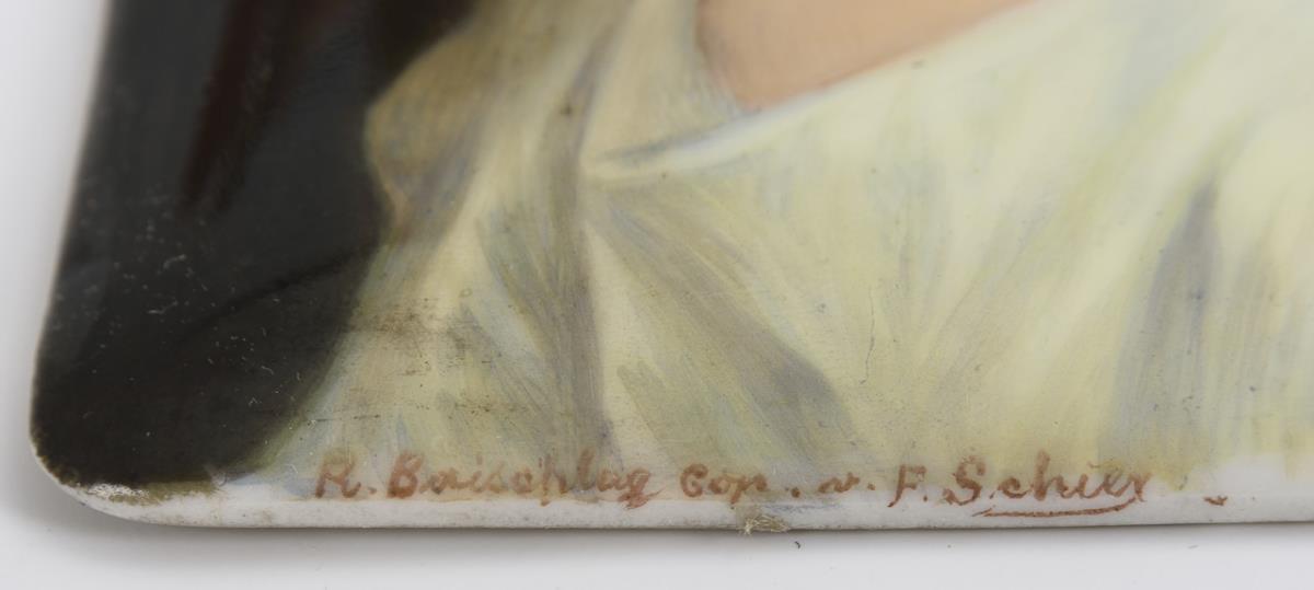 1x porcelain painting, signed "R. Baischlag cop. n. F. Schier" (= Franz Schier, 1909-1954): Profile portrait of a young woman with rose in her hair (12,5 x 10,5 cm, in gold-bronzed frame 17,5 x 15 cm). / 1x porcelain picture: oval plaque with the portrait of the painter Elisabeth Vigee Lebrun (1755-1842), after a self-portrait of the artist (L 6.3 cm, in a loop-crowned brass frame [L 9.5 cm]).