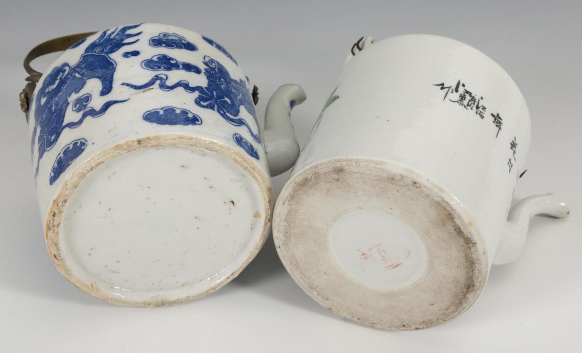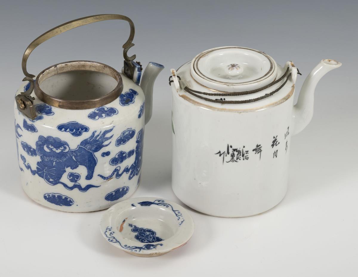 Jug with underglaze blue decoration, qilin between clouds. Brass mount around upper rim and as handle. Small fire crack in shoulder. / Pitcher with polychrome painting, magpie on peony flower, on back and shoulder characters. Two twisted metal handles and base of the spout with underglaze relief, gold rim somewhat rubbed.