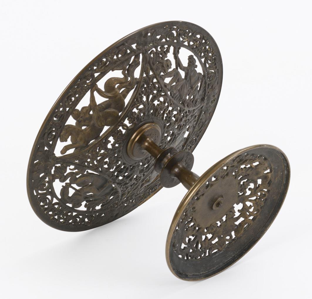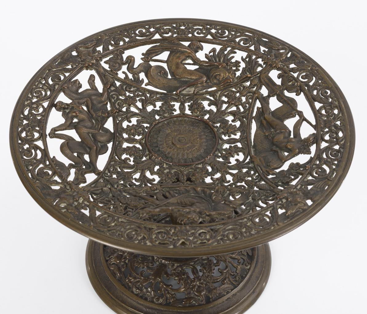 After a design by Friedrich Schinkel (for an iron casting) à-jour worked bronze tazza with river gods in tendril ornament around central rosette as well as ornamented round base.