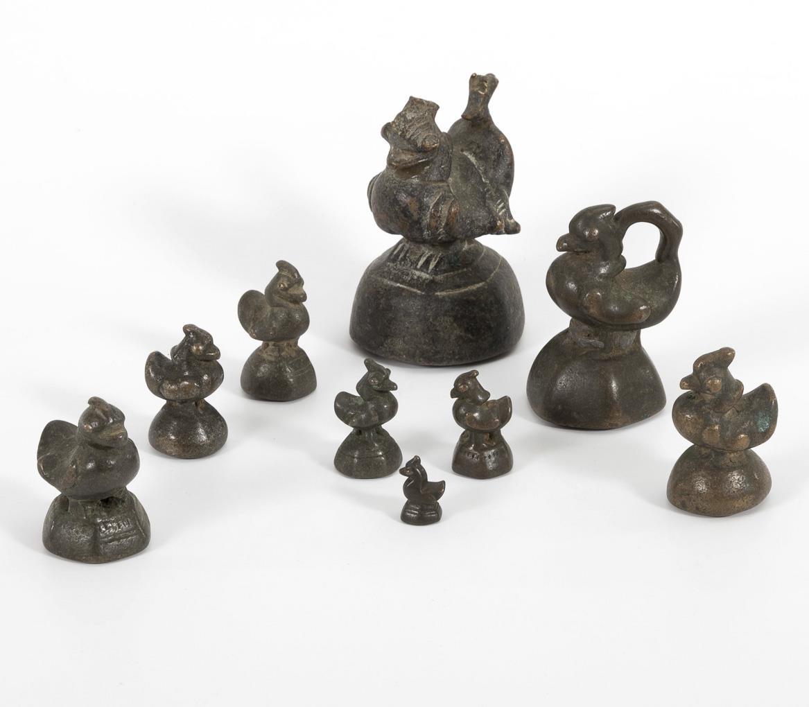Openwork hexagonal container with lid and the possibility of sealing. Possibly document container? L 36 cm. / Set of weights consisting of 9 chicken molds of different sizes and weights. H 2.5 - 10 cm.