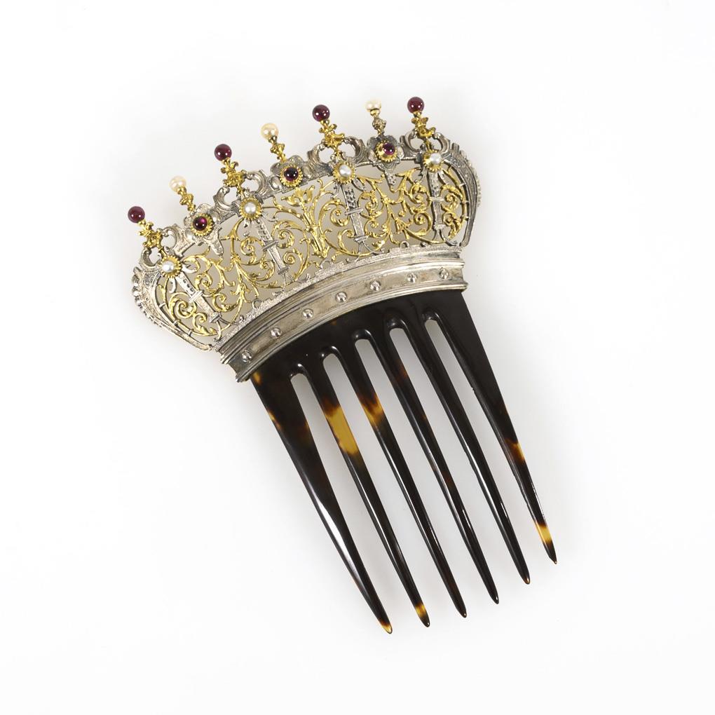 Large comb with vine decorated crown-like mount set with pearls and garnets. In black case with silver engraved monogram mount H v R.