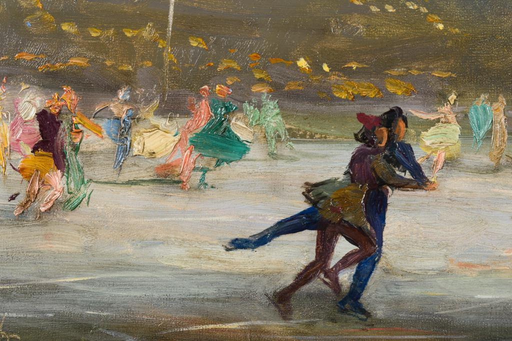 Eistänzer auf der Bahn, umringt von vielen Zuschauern.