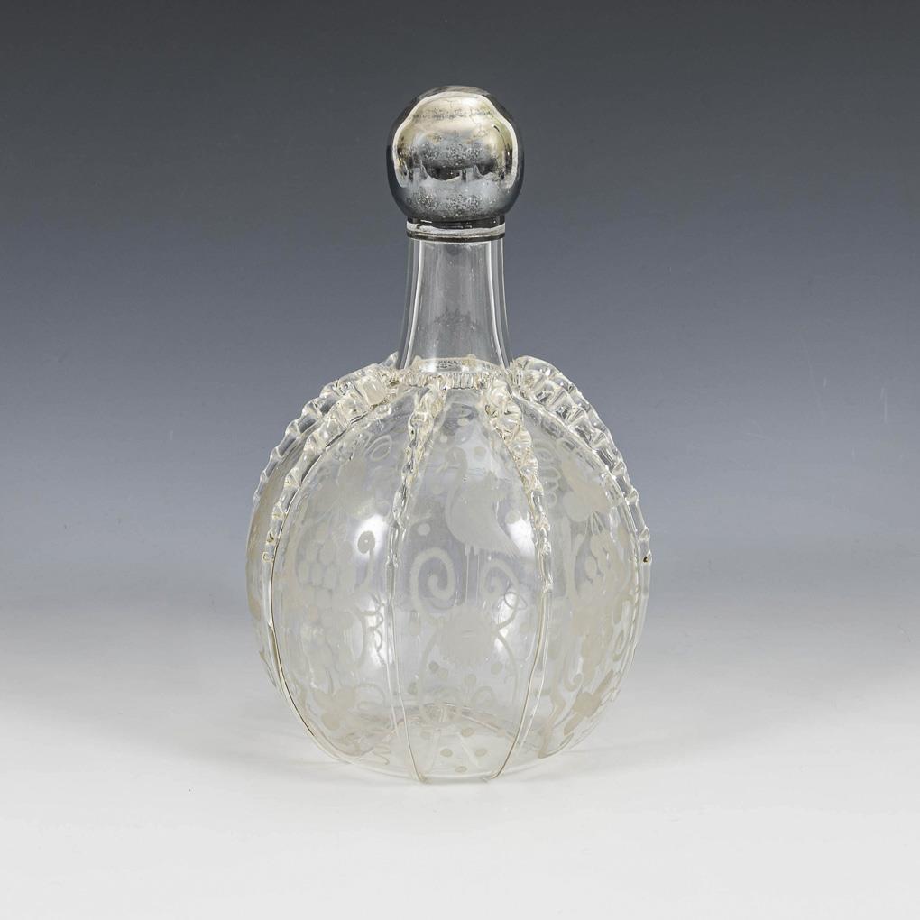 Bellied, richly cut carafe with fused glass threads and spherical stopper. Small bumps on the glass.