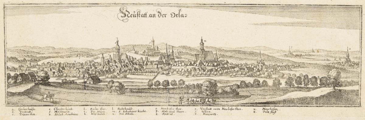 4 historical panoramic views of towns from Thuringia: titled "Arnstatt" (Arnstadt), printing plate: ca. 10 x 32,5 cm | "Neustatt an der Orla" (Neustadt an der Orla), with legend, printing plate: ca. 10 x 32 cm | "Grossen Sömmern" (Sömmerda), printing plate: ca. 8.5 x 32 cm and "Tennstatt" (Bad Tennstedt), printing plate: 9.5 x 35 cm; from "Topographia Germaniae", Volume 12 "Topographia Superioris Saxoniae / Thuringiae / Misniae / Lusatiae", 1650. Leaves trimmed and with centerfolds, Neustadt an der Orla with addition.