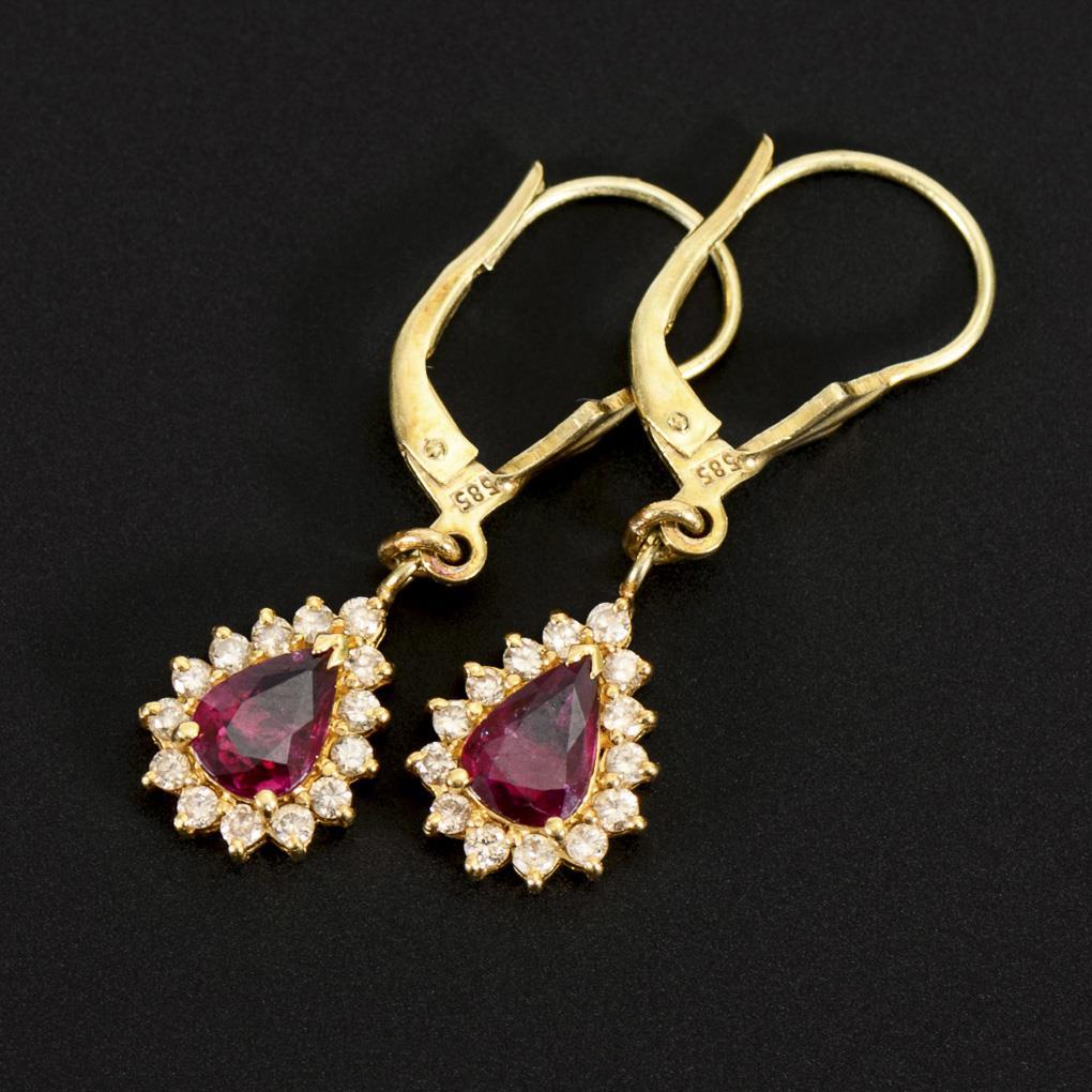 Suspension set with claw-set rubies, each surrounded by 14 small diamonds. Spring bail.