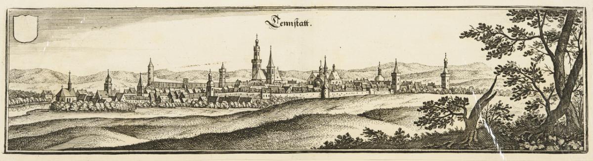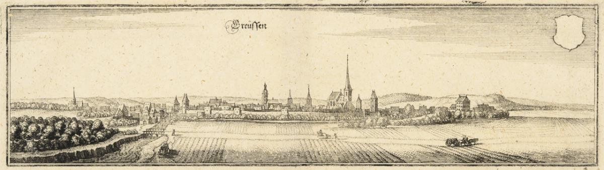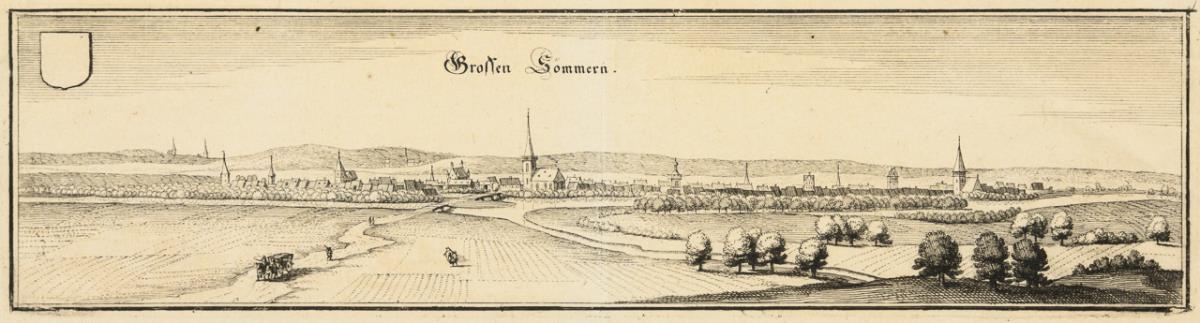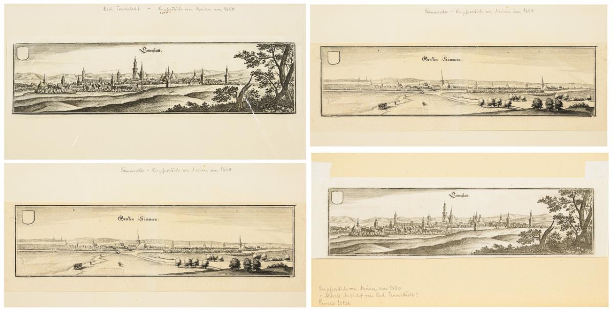 4 historical panoramic views of towns from Thuringia: titled "Grossen Sömmern" (Sömmerda), printing plate: ca. 8,5 x 32 cm | "Tennstatt" (Bad Tennstedt), printing plate: ca. 9 x 35 cm | "Greussen" (Greußen), printing plate: ca. 9 x 32 cm and "Sangerhausen", printing plate: 10.5 x 32.5 cm; from "Topographia Germaniae", Volume 12 "Topographia Superioris Saxoniae / Thuringiae / Misniae / Lusatiae", 1650. Leaves trimmed and with centerfolds.