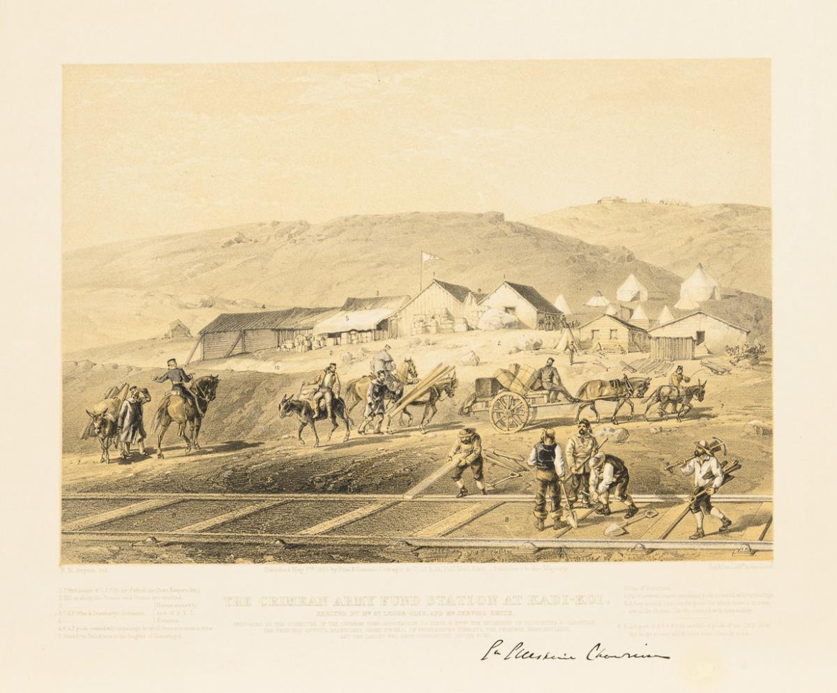 Depiction of the British Army's mitlitary tent camp at Kadikoi in present-day Ukraine during the Crimean War, inscribed "The Crimean Army Fund Station at Kadi-Koi erected by Mr St Leger Glyn and Mr Jervois Smith", "published May 7th 1855 by Paul & Dominic Colnaghi [...]", with legend in English. Somewhat foxed, margins rubbed.